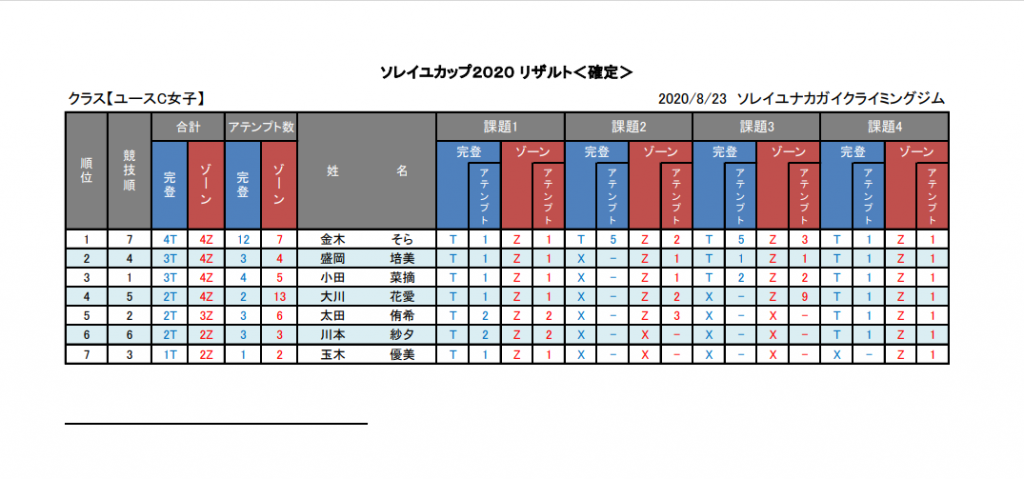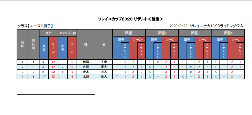 ユースC男子、オープン女子 ①課題 平嶋 ②課題 藤原 ③課題 平嶋 ④課題 藤原